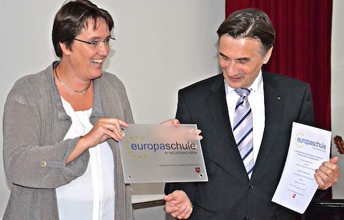 Der Titel „Europaschule in Niedersachsen“ führen zu dürfen, sei kein Selbstläufer, betonte Silvia Pünt-Kohoff. Dafür müssten sich die Schulen schon bemühen. Die Voraussetzungen für die offizielle Zusatzbezeichnung seien nicht leicht zu erfüllen. Alle fünf Jahre müssten sich die Schulen erneut an den Kriterien messen lassen, wollten sie den Titel behalten. Dem Ulrichsgymnasium in Norden sei dies in hervorragender Weise gelungen. Die Dezernentin hatte nicht nur eine Urkunde im Gepäck, sondern überreiche dem stolzen Schulleiter, Wolfgang Grätz, eine Tafel, um die Auszeichnung auch nach außen am Schulgebäude dokumentieren zu können, sowie eine Europafahne, die zu besonderen Anlässen gehisst werden kann. Für Grätz bedeutet Europa vor allem eins: Frieden. Die Mütter und Väter der Europäischen Union hätten sich unschätzbare Verdienste erworben, indem sie die Voraussetzungen für ein friedliches Miteinander in Europa geschaffen hätten. „Aber Frieden gibt es nicht umsonst. Er muss gehegt und gepflegt werden und dazu ist immer wieder neuer Einsatz notwendig“, betonte der Schulleiter. Europaschulen könnten und sollten dazu beitragen.