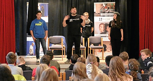 Als es dabei um die Ausgrenzung eines Menschen ging, wurde schnell deutlich, welche kleinen Anmerkungen bereits zum Mobbing werden können. In dem gespielten Fall war ein Schüler an Neurodermitis erkrankt. Durch das ständige Kratzen und die Schuppenbildung der Haut hatten Mitschüler schnell einen vermeintlichen Grund gefunden, um Beleidigungen und Anfeindungen auszusprechen. Die Folge war eine emotionale Reaktion des Opfers. „Diese Art des Mobbings ist leider sehr häufig zu beobachten. Dabei entsteht eine Gruppendynamik, wobei am Ende alle gegen einen sind“, sagte Kaufmann. Und er ergänzte, dass die Ausgrenzung für das Opfer schlimme Folgen haben kann. Die Kinder fanden gemeinsam mit den Darstellern eine Lösung, um Konflikte dieser Art im Keim zu ersticken und das Opfer zu schützen.