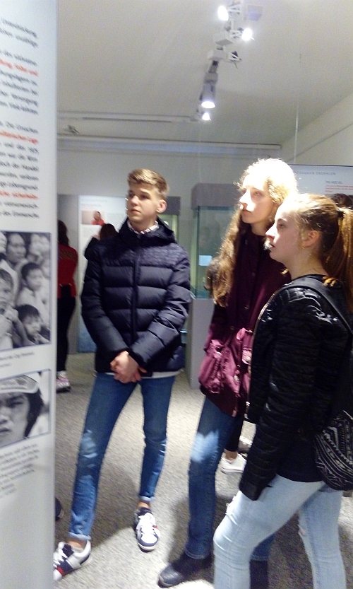 Am Freitag, 6.4. wurde als erster Schritt ein Einstieg in das Thema durch den Besuch der Ausstellung über das Schicksal der Boat-People im Norder Teemuseum versucht. Die Schüler arbeiteten im deutsch-ukrainischen Tandem, d.h., jeder deutsche Schüler war dafür verantworlich, dass sein ukrainischer Austauschpartner alles verstand, und bearbeiteten gemeinsam ein Arbeitsblatt. Sie sollten sich für eine der dargestellten Personen entscheiden und ein Handybild von deren Portrait machen. Dann sollten sie herausfinden, warum dieser Mensch geflüchtet ist, was er auf seiner Flucht erlebt hat und was ihm geholfen hat, in Deutschland anzukommen. Ihre Ergebnisse sollten am Montag in der Schule vorgestellt werden.
