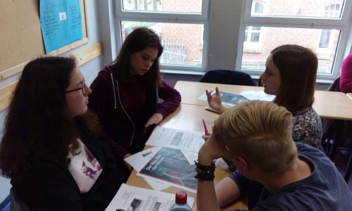 Die Arbeit im Tandem erwies sich als sehr zielführend, da die deutschen SchülerInnen, indem sie ständig die relevanten Informationen herausfiltern und diese dann ihren Partnern erklären mussten, sich besonders intensiv mit dem Thema auseinandergesetzt haben. Ein positiver Nebeneffekt war, dass durch diese intensive Zusammenarbeit mehr Vertrautheit zwischen den Austauschpartnern entstand und die ukrainischen Jugendlichen gleich ins Reden in der Zielsprache Deutsch kamen. Da die Ergebnisse innerhalb der gesamten Lerngruppe vorgestellt werden sollten, bemühten sich alle Beteiligten um stimmig formulierte Ergebnisse. Die nächste Etappe bzw. der Hauptprojekttag fand am Montag, 9.4.18 statt. In den ersten zwei Stunden sollten die Schüler sich Grundlagenwissen über das Thema aneignen, danach sollte durch konkrete Anschauung direkt erfahren werden, wie Geflüchtete in Norden leben, was ihnen hilft und welche Probleme es gibt. Zunächst stellten die Schüler ihre Ergebnisse des Museumsbesuchs am Freitag vor. Die sehr emotionalisierenden Bilder der Ausstellung, z. B. die Fotos von überfüllten Booten der Vietnamflüchtlinge und die Darstellung der Fluchtursachen, verdeutlichten bereits, wie sehr das Schicksal dieser Menschen dem der Geflüchteten heute ähnelt. Er wurde deutlich, dass die Boat-People vor allem durch die klare Perspektive, bleiben zu dürfen, motiviert waren, sich in die Gesellschaft zu integrieren, was sich u. a. darin spiegelt, dass überdurchschnittlich viele Schüler mit vietnamesischem Migrationshintergrund das Gymnasium besuchen.