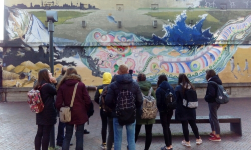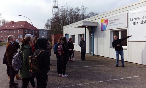 Wir verließen Utlandshörn tief beeindruckt gegen 14 Uhr. Die SchülerInnen werden sicherlich noch einige Zeit über die Erzählungen der Geflüchteten nachdenken. Wir haben außerdem erfahren, dass in dieser Einrichtung die Verbindung zwischen praktischer Arbeit in der Werkstatt und Sprachkurs besonders effizient beim Spracherwerb und für die Integration ist und dass auf vielerlei Art versucht wird, z. B. durch die Vermittlung von Praktika und Freizeitangeboten, eine Perspektive für die Geflüchteten zu schaffen. Was aber nach wie vor noch gebraucht wird, sind Kontakte zur ansässigen Bevölkerung. Die dritte Etappe der Projektarbeit fand am Mittwoch, 11.4. während unseres Ausflugs nach Emden statt und stellt eine Erweiterung der Betrachtung des Themas vor allem im Bereich der Kunst dar. Herr Thiele erzählte vor einer großen Grafittiwand zum Thema „Flucht“, wie stark die Stadt Emden in der Nachkriegszeit von diesem Phänomen betroffen war.