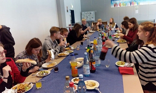 Wir nahmen anschließend in kleine Gruppen aufgeteilt an den Deutschsprachkursen teil, wo wir mit einigen Geflüchteten ins Gespräch kamen. Wir erfuhren z. B., dass in Libanon die Polizei Flüchtende aufgreift, in Gefängnisse sperrt und nur gegen ein Lösegeld von 5000 Euro wieder freilässt, dass in der Wüste Gefahren durch Räuber drohen, dass ein Teilnehmer dieses Deutschkurses fast ertrunken wäre, weil sein Schlauchboot kaputt ging und wie furchtbar lange die Menschen unterwegs waren. Einige mochten gar nichts erzählen, sagten nur, dass die Flucht furchtbar gewesen sei, andere hatten, während sie erzählten, Tränen in den Augen. Wir merkten, dass es etwas anderes ist, diese furchtbaren Ereignisse als persönliche Geschichte erzählt zu bekommen statt davon aus den Medien zu erfahren. Gegen Mittag kochten wir gemeinsam mit einigen Bewohnern des Flüchtlingsheims ein leckeres eritreisches Wrap mit Humus und Salat., das wir dann im großen Speisesaal der Einrichtung verzehrten.