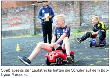 Das Motto des Tages, der nicht nur als Sport-, sondern zugleich auch als Schulfest diente, hatte die AG „Schule ohne Rassismus, Schule mit Courage“ gewählt, weil Sport keine Unterschiede kennt, son- dern vielmehr die gegenseitige Unterstützung, gleich welcher Nationalität und Herkunft, in den Fokus rückt. Der Zusammenhalt der Schüler untereinander stand auch für Schulleiter Grätz im Mittelpunkt des Tages, der sich besonders darüber freute,„dass alle mitmachen“.