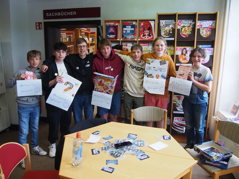 Hier haben viele Interessierte in freundlicher und der für die Stadtbibliothek typischen, gemütlichen Atmosphäre nach Herzenslust neue Brettspiele kennengelernt. Dank der tatkräftigen Mithilfe von Schülern der Brettspiel AG des UGN mussten dafür keine Regeln gelesen werden! In Vorbereitung für den Einsatz als Erklärer haben die Schüler im Rahmen des AG-Ganztagsangebots die betreffenden Spiele selbst kennengelernt und das Erklären geübt. So konnten wir schließlich bis zu 20 verschiedene Brettspiele zum Kennenlernen in verschiedenen Sprachen (Arabisch, Deutsch, Englisch, Französisch und Russisch) anbieten.