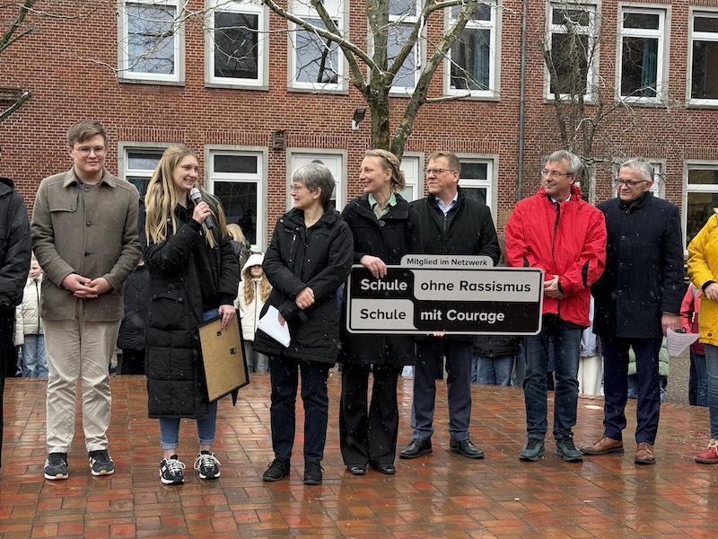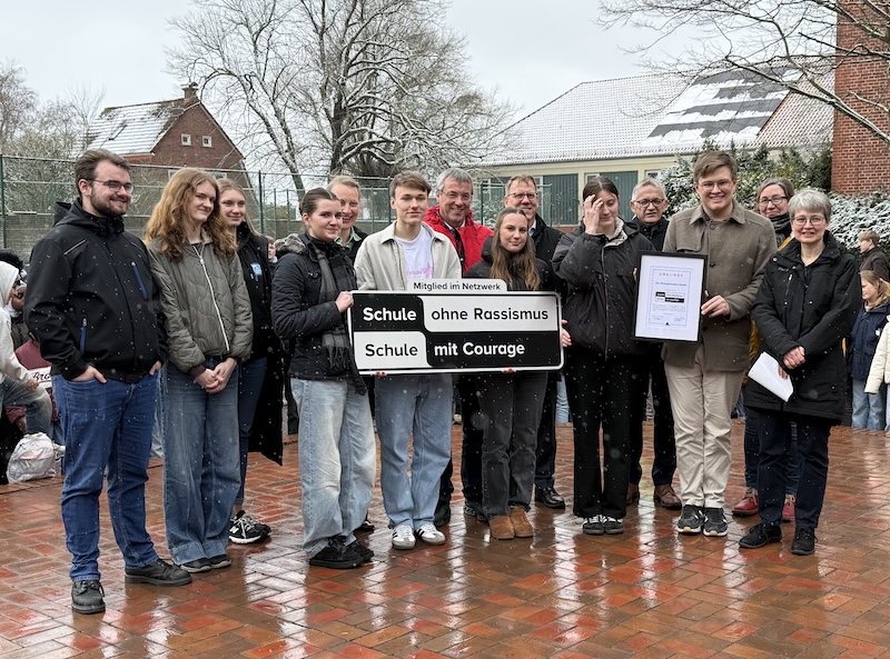 Die Aufnahme wurde in einer feierlichen Stunde in der Mensa begangen. Gemeinsam mit dem Paten der Schule, MdB Johann Saathoff, Landrat Olaf Meinen, Dezernent Dr. Knut Engeler, der stellvertretenden Bürgermeisterin Dr. Weinbach sowie Vertreterinnen und Vertretern des Landkreises feierten Lehrkräfte und rund 400 Schülerinnen und Schüler ein Fest im Zeichen von Demokratie und Zivilcourage.