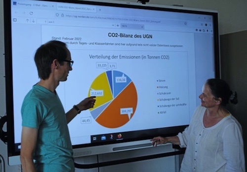 Darunter fällt der Strom, die Heizung, das Schulessen, die Schulwege der Lehrkräfte und der Schülerinnen und Schüler und der Abfall. Normalerweise kommen auch noch die CO2-Emissionen der Tagesausflüge und Klassenfahrten hinzu. Diese wurden bei der Berechnung des UGN aufgrund teils nicht valider Datenbasis ausgelassen. „Die Datenerhebung ist sehr umfangreich und wurde durch Corona erschwert“, erklärt Fisahn. Es gab viel zu tun, doch die Unterstützung seitens der Schule war groß. Die meisten CO2-Emissionen der Schule lassen sich auf die alte Heizung zurückführen, gefolgt vom Strom und den Schulwegen der Schüler und Schülerinnen.
